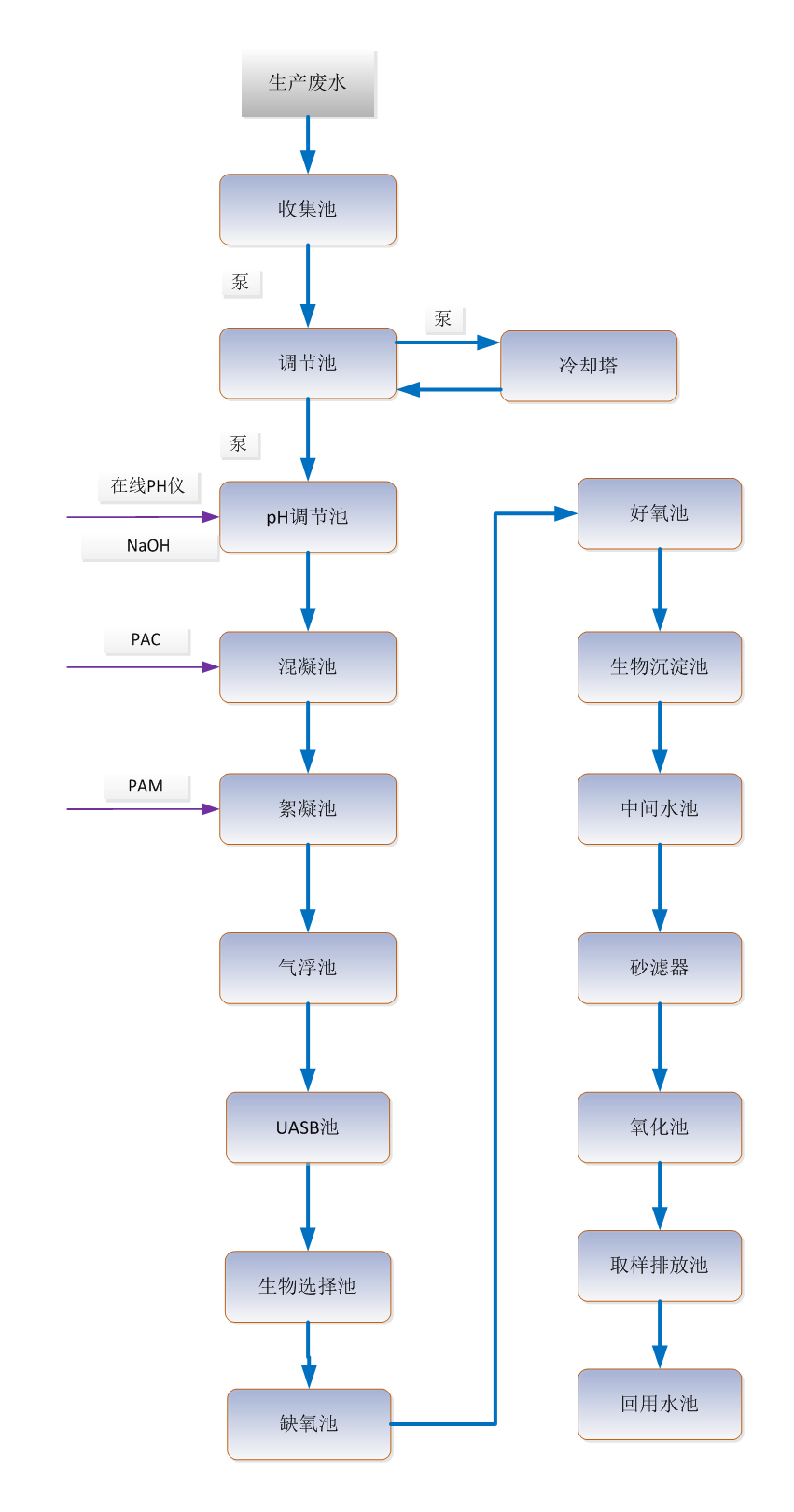 生產廢水進入收集池,然后泵入調節池,經調節池調節,均勻水質水量。池內設置溫度儀,水溫高于40℃將啟動提升泵打至冷卻塔降溫,水溫低于40℃則啟動提升泵打至pH調節池。然后經過混凝和絮凝處理,再進入氣浮池,去除水中細小懸浮物及膠體物質后進入厭氧進水池,厭氧系統采用UASB反應器。出水進入生物選擇池、缺氧池及后端好氧池,能有效去除COD和氨氮。缺氧池出水自流到好氧池,經過生化沉淀池泥水分離,上清液進入中間水池,經砂濾器過濾進一步去除懸浮物,然后進入氧化池,氧化池設置活性炭填料并通入臭氧,保證終出水水質。氧化池出水流入取樣排放池和回用水池,設置回用水泵將水輸送至用水點。