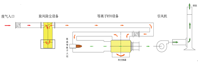 等離子RTO是蓄熱式等離子焚燒裝置。 等離子RTO與燃?xì)釸TO的結(jié)構(gòu)相似,工作機(jī)理、處理效果完全一致。